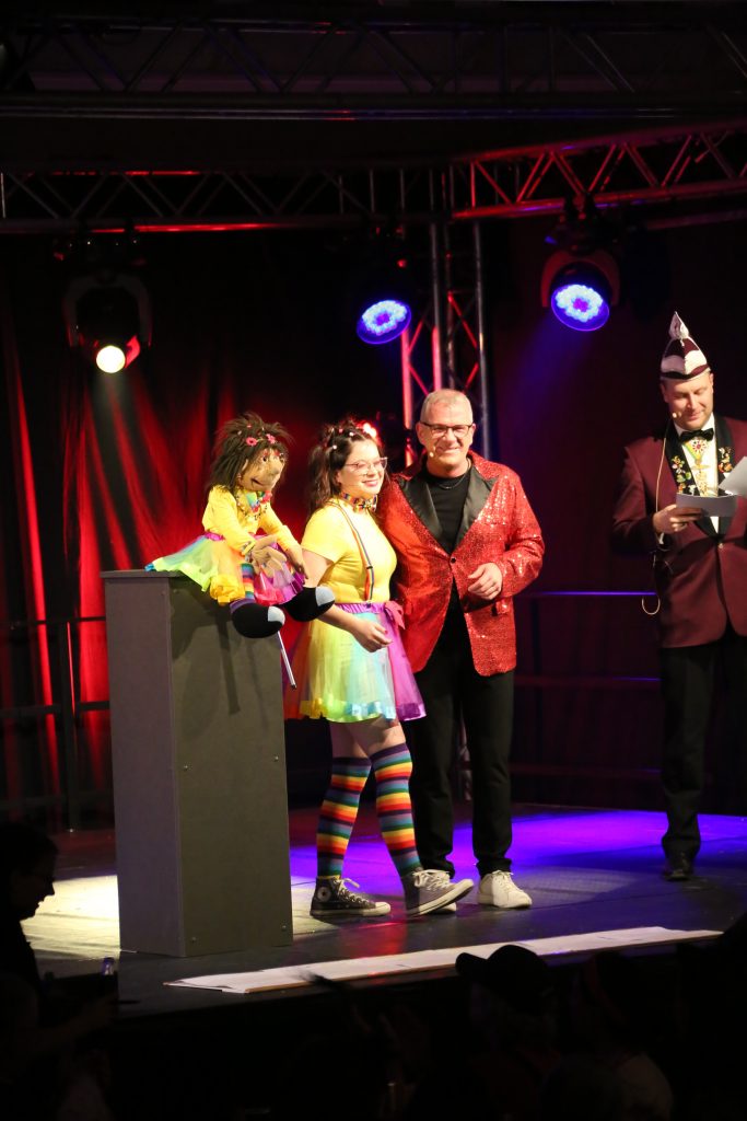 Ein echter Knaller war der Bauchredner-Auftritt unseres Elferrats Marc Schwander mit seiner Puppe Frieda. Bereits zu Beginn entwickelte Frieda ein munteres Eigenleben und zog mit frechen Kommentaren und pointierten Kalauern sofort die Aufmerksamkeit des närrischen Publikums auf sich.
