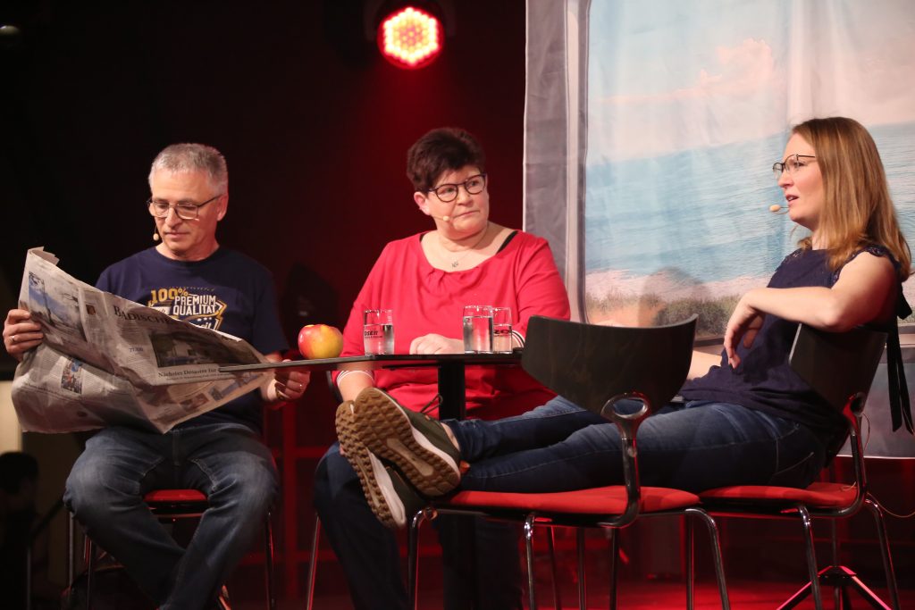 Den politischen Geschehnissen des vergangenen Jahres widmete sich unser Aktiver Rüdiger Zoller zusammen mit seiner Frau Beate und deren Tochter Jessica. Per Fahrt mit der deutschen Bahn starteten sie im lokal-politischen Bahnhof und fuhren weiter, mit Zwischenhalten auf regionaler und überregionaler Ebene, bis sie ihre Endstation Weltpolitik erreichten. Mit ihrem Leitmotiv: „Thank you for travelling with Deutsche Bahn“ berichteten sie u. a. vom Personalengpass im Iffzer Rathaus, den überfahrenen Signalen der Bundesregierung und wunderten sich, dass bei Trump niemand die Notbremse zieht, egal wie rasant die Fahrt auch wird. Ohne Umschweife wurde jegliche Entgleisung schonungslos benannt.